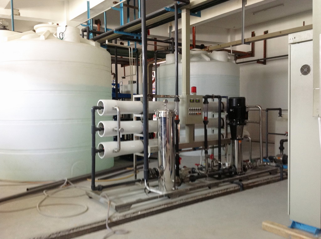 设备简介:20T/H RO反渗透纯水系统。 行业用途:电器外壳喷涂行业工业用水 产水水质:小于10μs/cm 设备流程:原水→多介质过滤器→活性炭过滤器→精密过滤器→中间水箱→反渗透纯水设备→ 纯水储水箱→纯水泵→后置保安过滤器→用水点